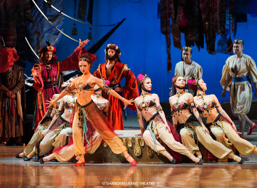 马林斯基的这版《海盗》不仅是一部芭蕾舞剧,也是一场视觉盛宴。海盗船从绘景到实景细致讲究,船帆、绳索俱全,还原海上生活的壮阔;奴隶市场圆台复刻市集喧闹,仿佛能听见周遭嘈杂;苏丹后宫尽显皇家奢华;皇家花园则如流动金箔画,舞者轻盈其间,地中海浪漫扑面而来。