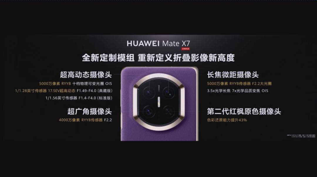 去年 Mate X6 的影像其实就堆得很猛,今年 Mate X7 同样也塞进了全 RYYB 镜头、可变光圈的主摄、潜望长焦以及第二代红枫原色摄像头。